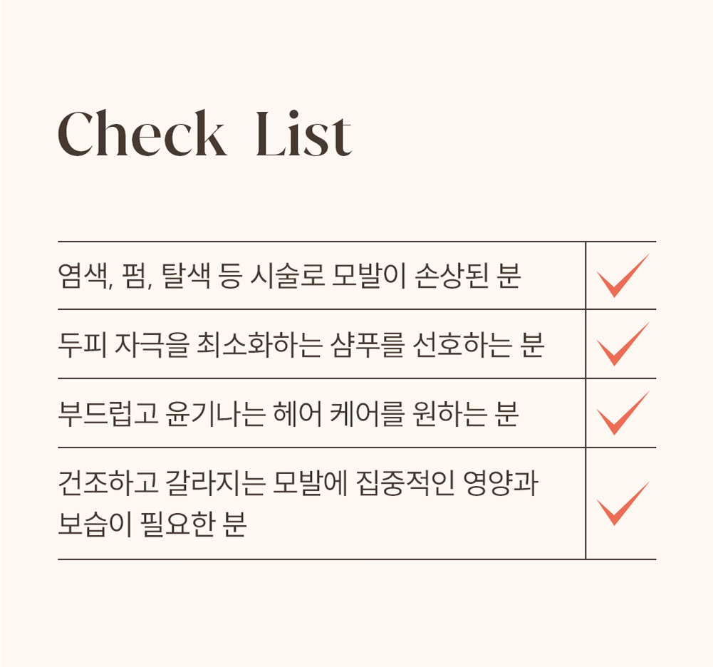 풍부한 단백질과 모발 친화 성분이 큐티클을 정돈하고 윤기를 더해줍니다.