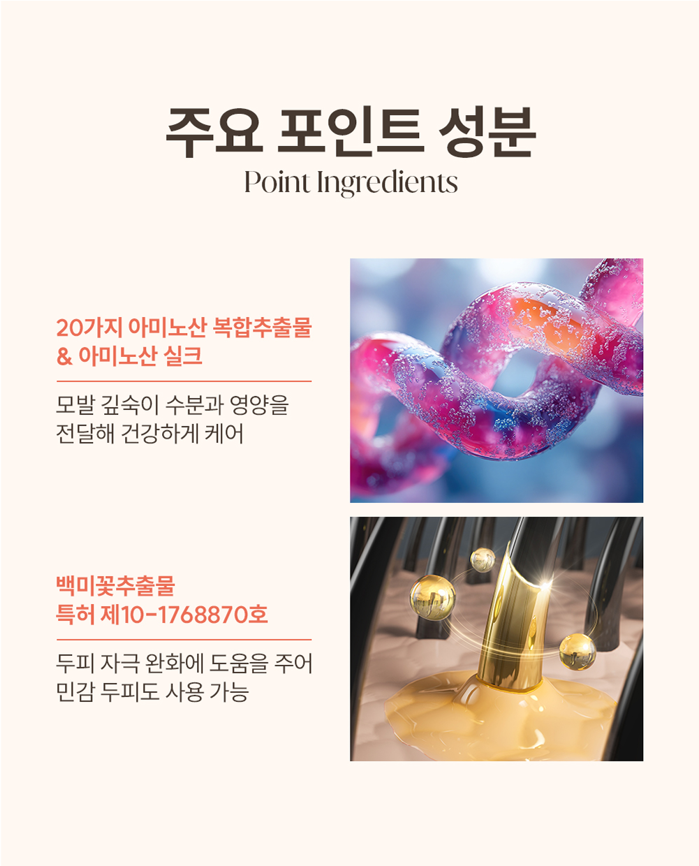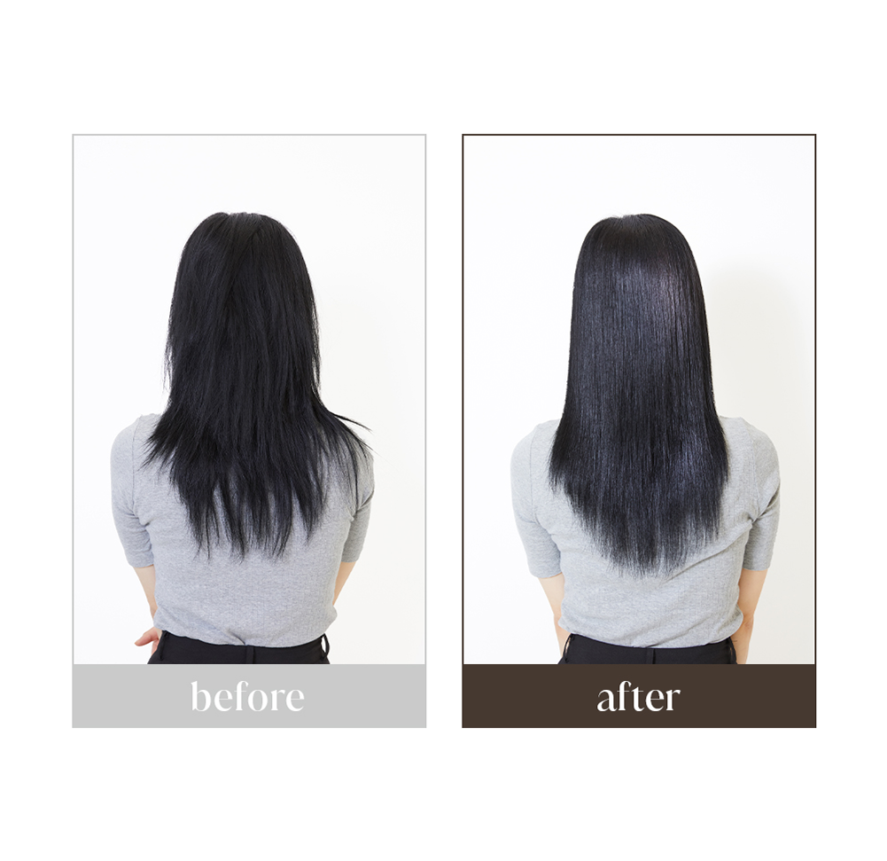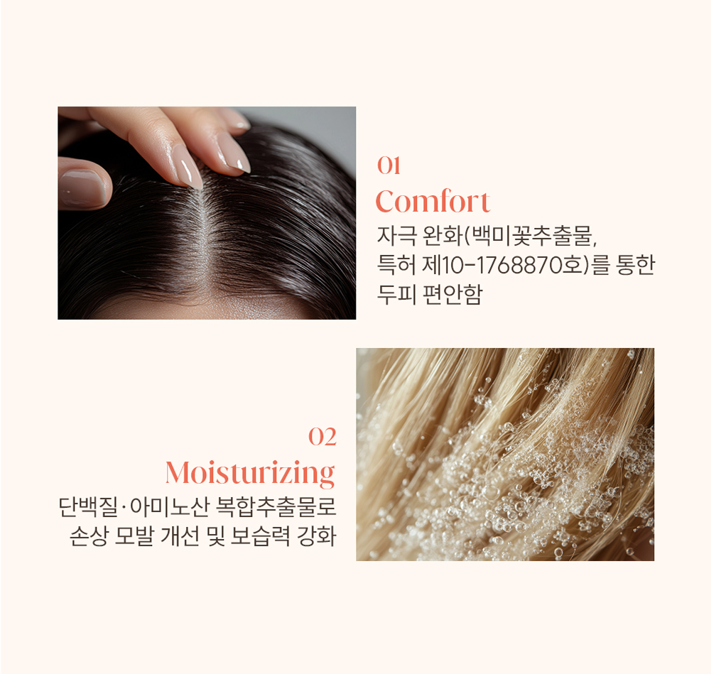 풍부한 단백질과 모발 친화 성분이 큐티클을 정돈하고 윤기를 더해줍니다.